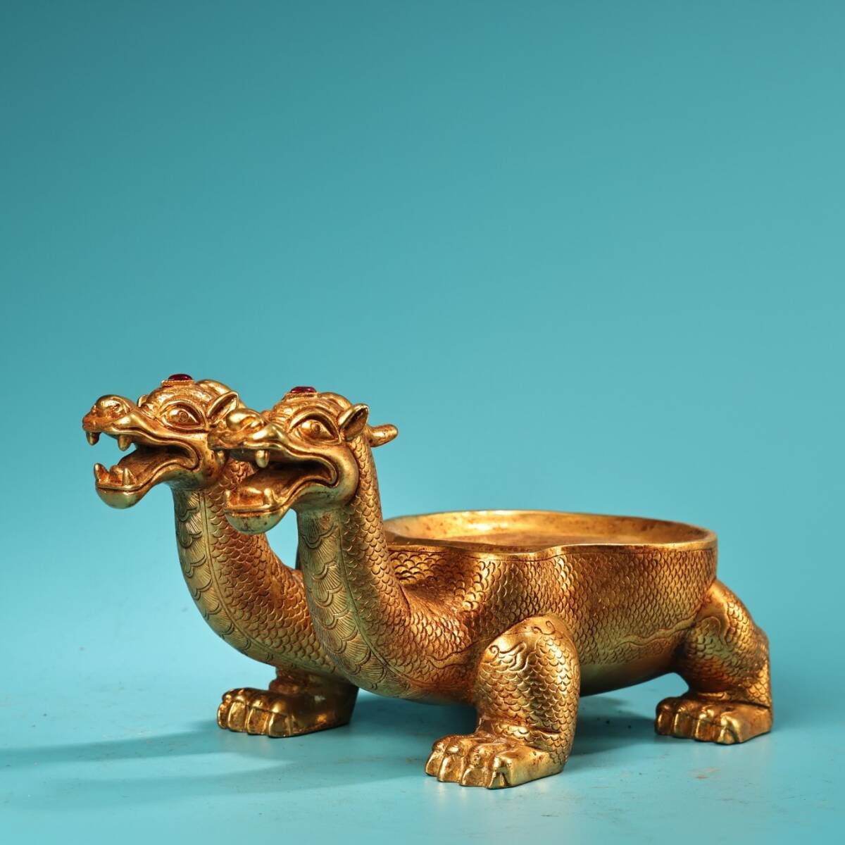 - 【超珍館蔵】銅製 塗金 雙頭龍龜筆洗 置物 賞物 古賞物 古董品 古美術品 時代物 旧家蔵出 稀少珍蔵品