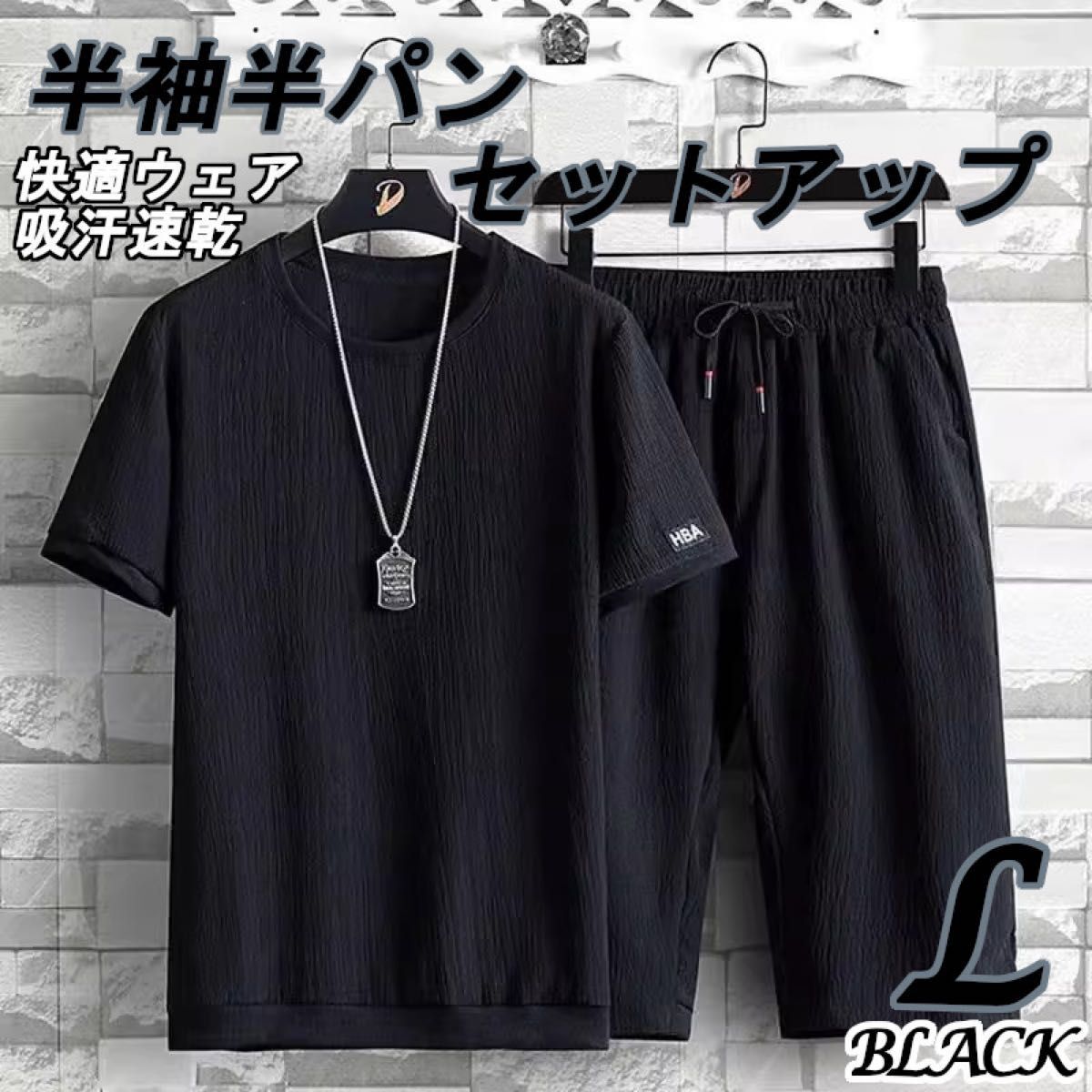 - L ブラック セットアップ上下 メンズ ルームウェア 半袖 半パン シワ加工 吸汗速乾 スポーツ
