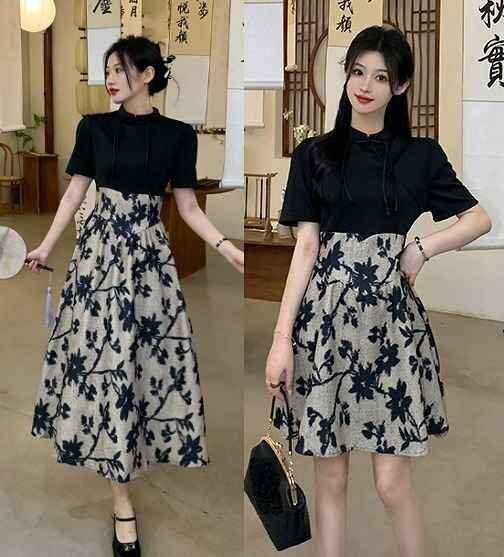 - 全2色 半袖ワンピース きれいめ エレガント 上品 かわいい ブラック 花柄【大きいサイズあり】 2XL ショート丈