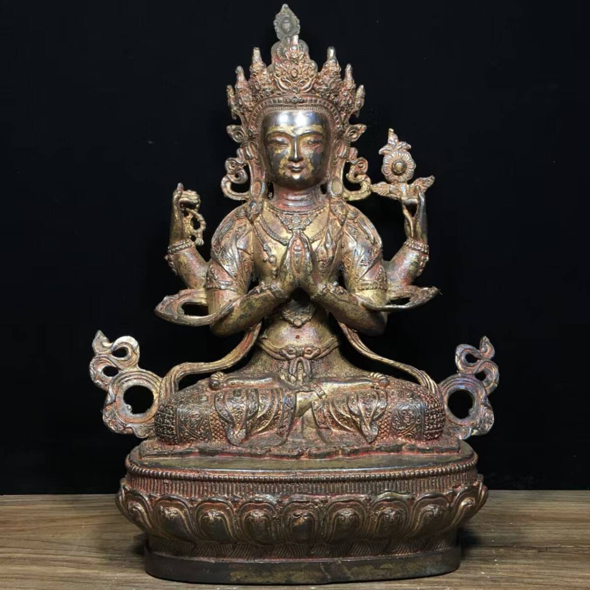 > 仏像 時代旧蔵 清時代 古銅泥金蔵伝四腕観音 銅製 仏教古美術 細密細工 廃寺旧蔵 廃寺買出品 古置物 中国古玩 9.3