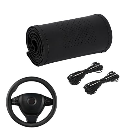 - ハンドルカバー ステアリングカバー 本革 編み込み 取付簡単 幅10.5cm 車 滑りにくい ぴったり ブラック×ブラック糸