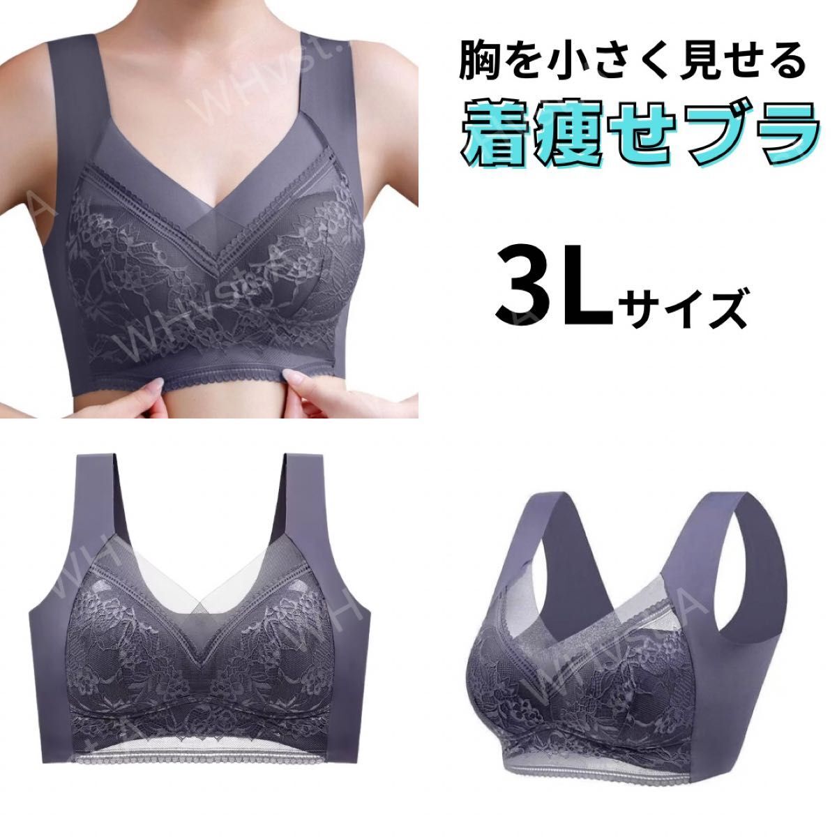 - 3L パープル 胸を小さく見せるブラ シームレス 着痩せ スマートブラ ノンワイヤー 美胸