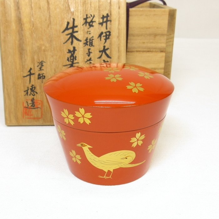 - 【B0562j】茶道具【 塗師 千穂造 】 井伊大老好 桜に雉子蒔絵 朱薬器 棗 茶器 共箱 即決 送料込み