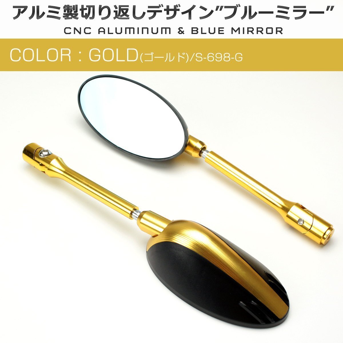 - アルミ製 切り替えしデザイン ミラー M8 M10 汎用 TYPE-A ゴールド 防磁ブルーミラー S-698-G