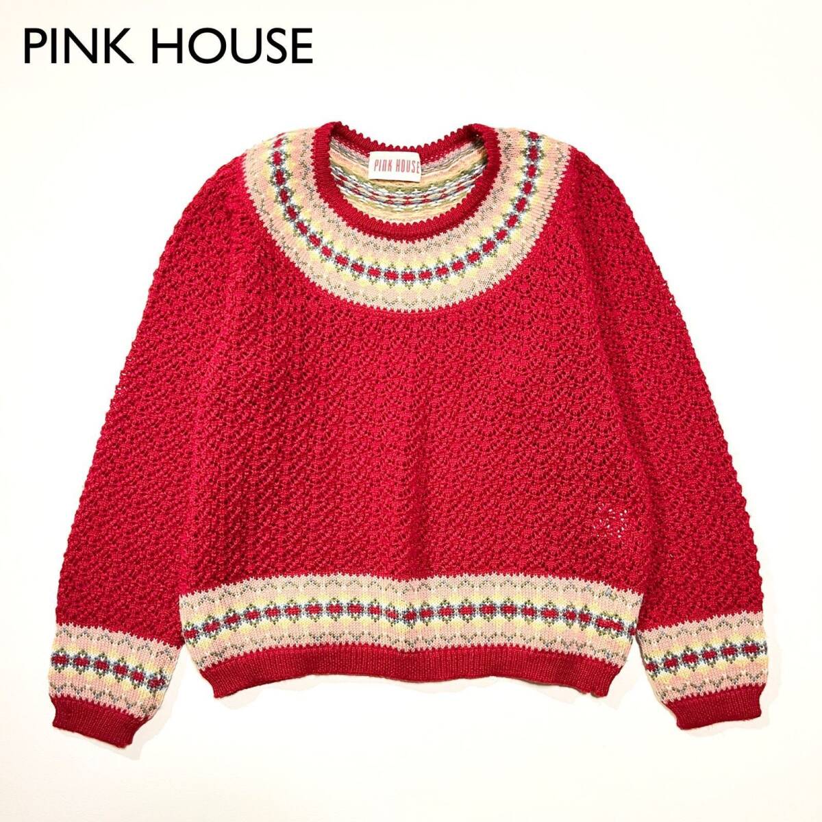 - cB62 PINK HOUSE ノルディック柄かぎ編みニット 総柄 刺繍 長袖セーター ニット 可愛い赤色 ピンクハウス