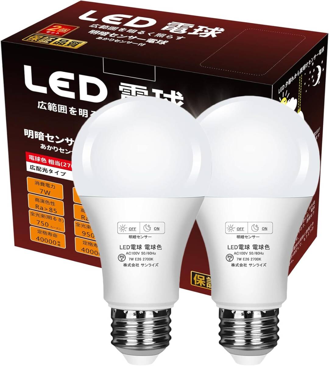> GOHDLAMP 明暗センサー電球 E26 電球色 60W相当 明暗せんさー 暗くなると自動点灯 常夜灯 足元灯 玄関灯 門灯 (7W電球色‐2個セット)