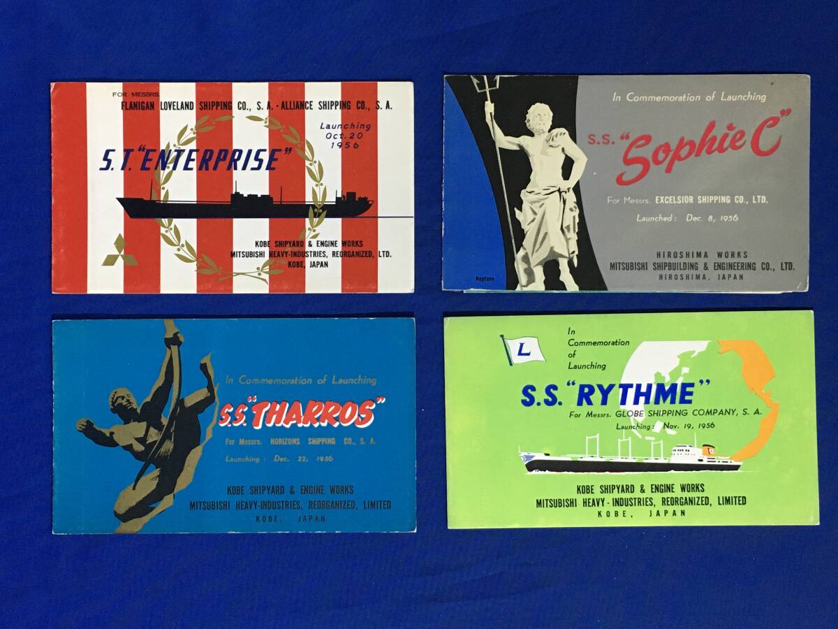 > AK667イ●昭和31年●海外向け【外国船舶進水記念:絵葉書4枚】THARROS/ENTERPRISE/他ギリシャ/貨物船/三菱造船神戸/広島/1956
