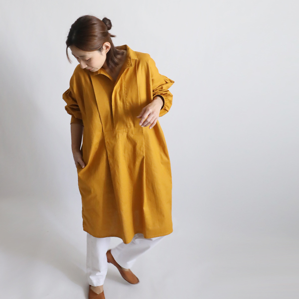 - 秋支度 ギマ擬麻コットン 羊飼いシャツ オーバー ロング シャツ 画家シャツ ゆったり 隠しボタン マスタードH14
