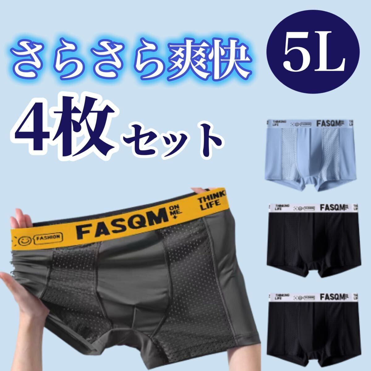 > 5L メッシュ メンズ ボクサーパンツ 4枚セット XXXXL 下着 ブラック ブルー グレー 黒 青 水色 灰色 通気性 4XL アイスシルク 接触冷感