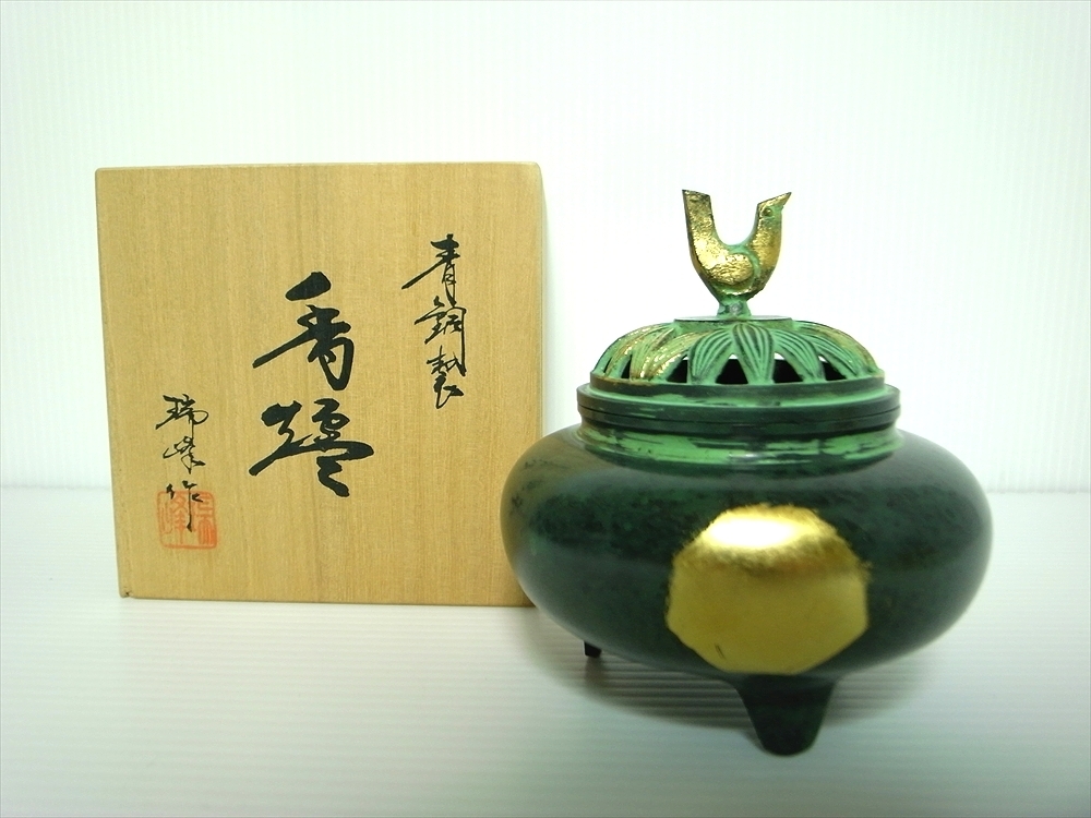 - 高岡銅器 青銅香炉 瑞峰作 珠玉緑金 香道具 共箱