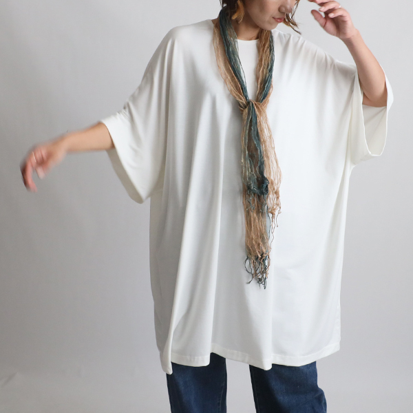 - 秋支度SALE 94cm丈 スムース伸縮ストレッチ カットソー生地かぶるだけポンチョ袖ワンピース ホワイト F80B