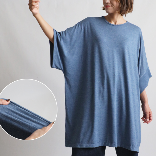 > 秋支度SALE 94cm丈 スムース伸縮ストレッチ カットソー生地かぶるだけポンチョ袖ワンピース サックスシャンブレー F80A