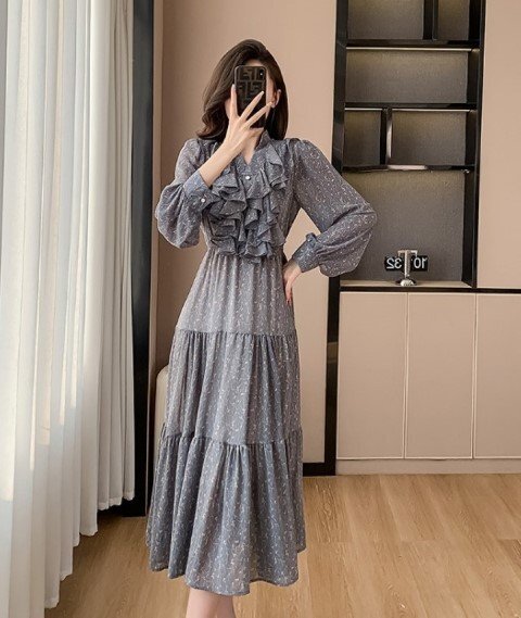 - 長袖ワンピ ロングワンピ きれいめ カジュアル フリル かわいい XL ブルー