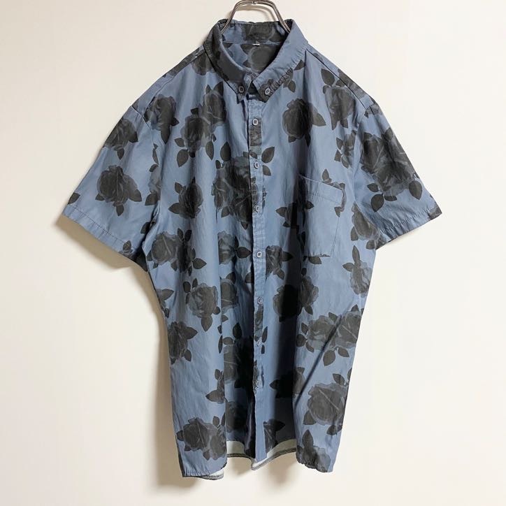 - 古着 used 半袖総柄シャツ 花柄 アロハシャツ バラ 青 ブルー レトロデザイン ビックシルエット XXLサイズ