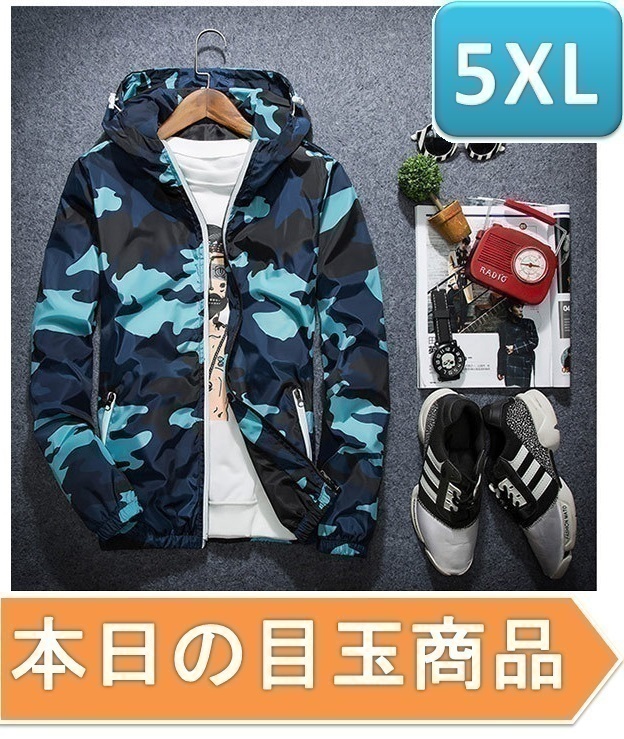 - 人気 【175】 迷彩 ウィンドブレーカー フード付き ブルー 5XL メンズ ナイロン カモフラ 柄 アウトドア 防風 軽量 ジャケット