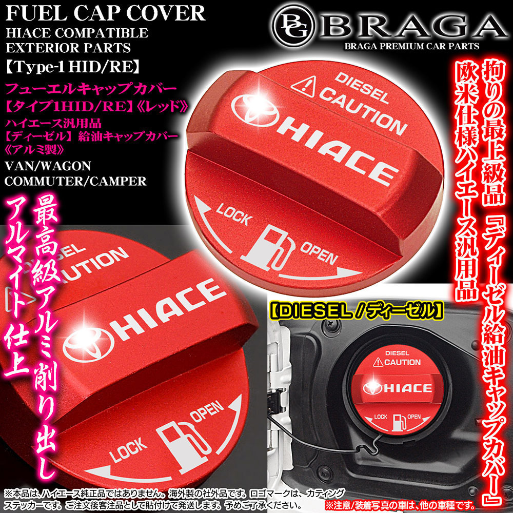 - タイプ1HID・RE/ハイエース ディーゼル給油フューエル キャップカバー/アルミ製アルマイト/レッド/カッティングステッカー付/客注/ブラガ