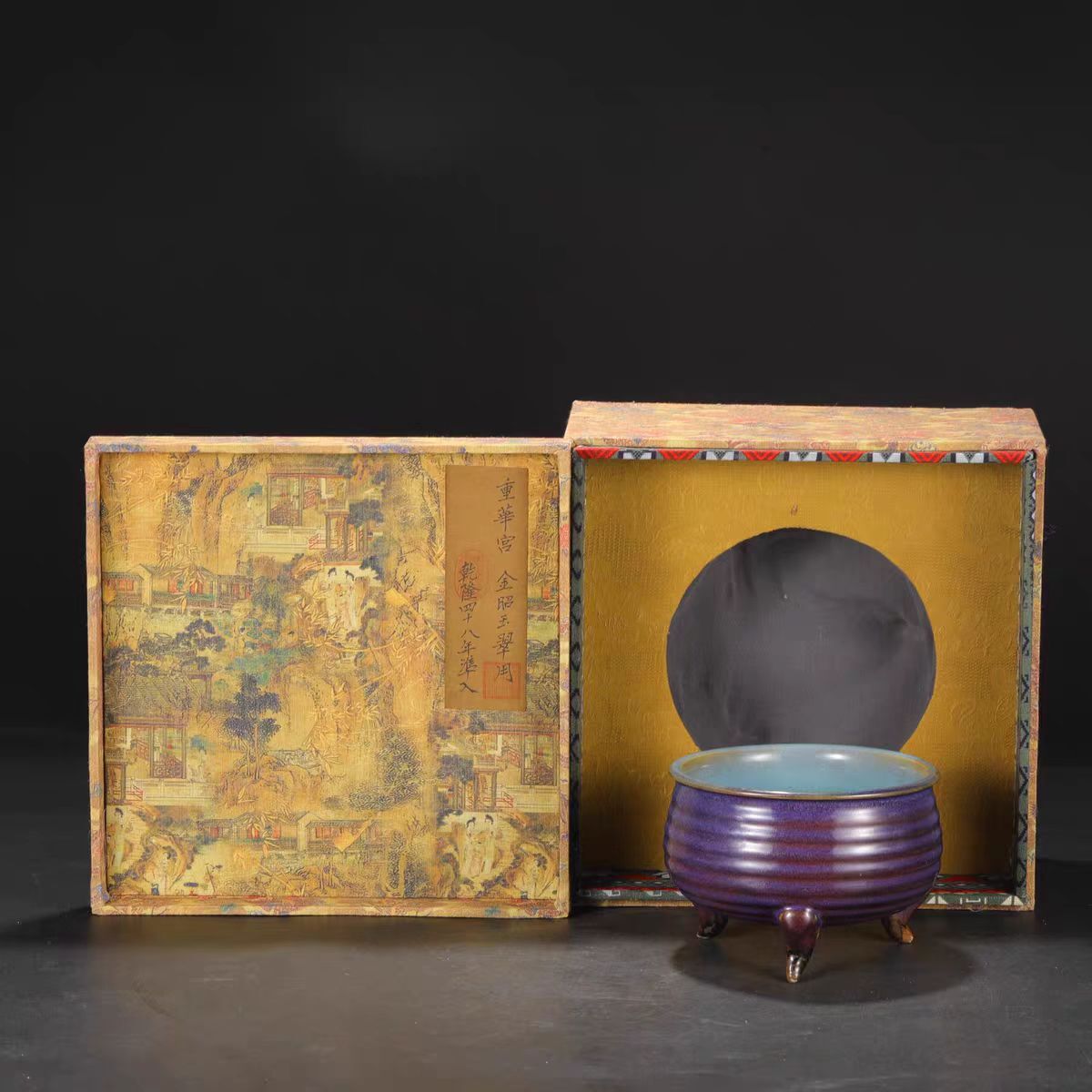 - 宋時代 鈞窯 紫紅釉 弦紋 三足炉 洗 文案置物 磁器 陶芸 擺件 時代物 古董品 骨董 旧家蔵出 唐物 中国古玩 古美術品