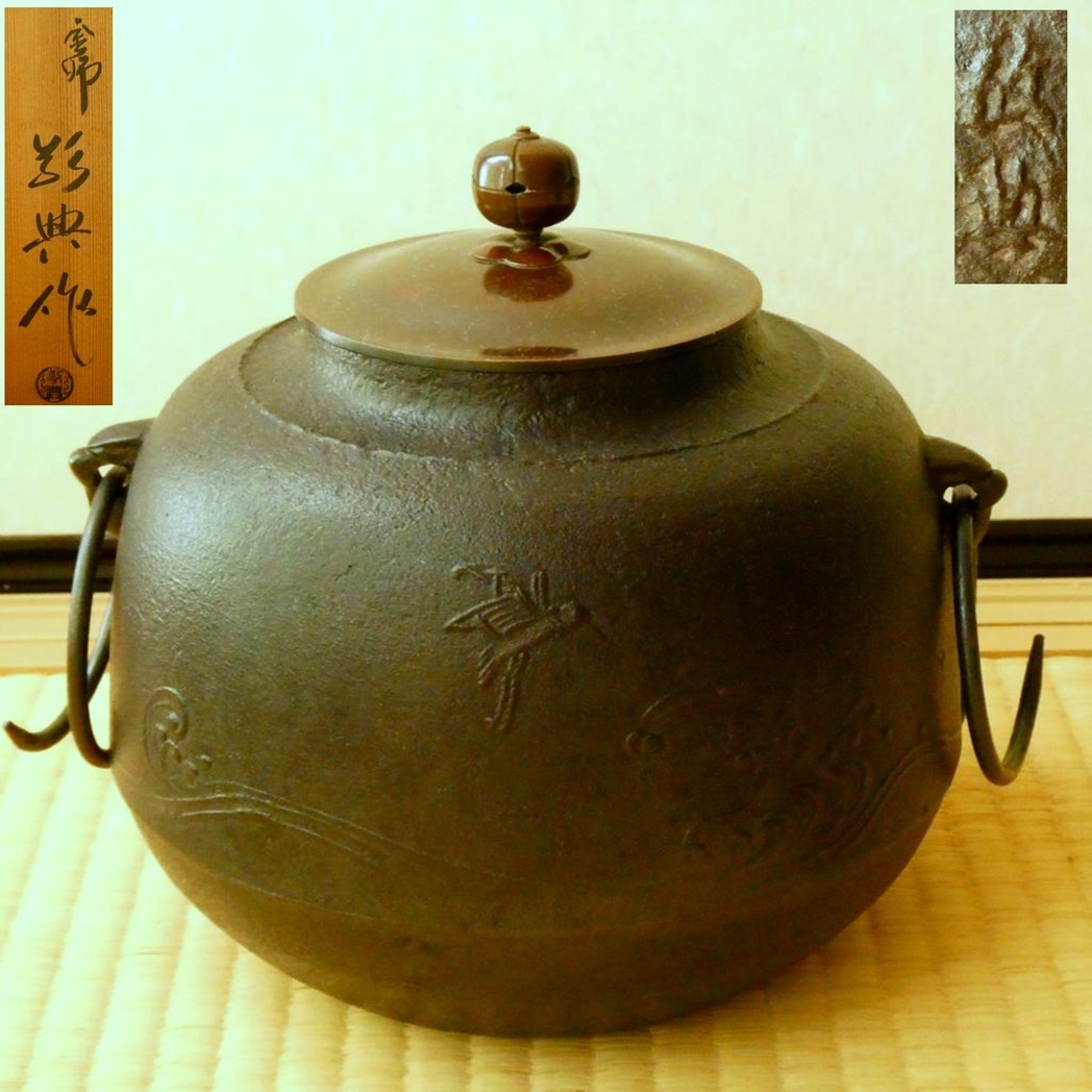 - 人間国宝 高橋敬典 波千鳥地紋 真形釜 検(鉄瓶 表千家 裏千家 茶碗 茶道具 菓子器 菓子鉢 茶入 棗 水指 建水 炉