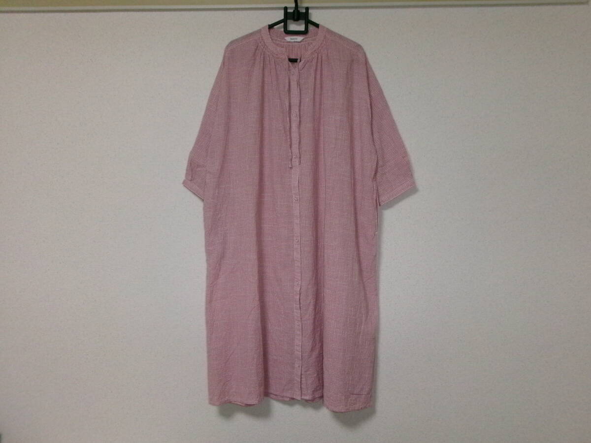 > Mushroomマッシュルーム☆淡い赤ピンク×白ギンガムチェック柄☆7分袖シャツチュニック☆ゆったり♪スモッグ風ワンピース☆綿ガーゼ素材☆L