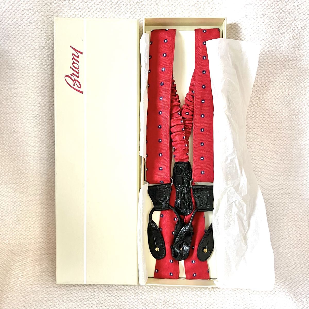 - 未使用 Brioni ブリオーニ サスペンダー メンズ フォーマル カジュアル ベルト X型 45mm ボタン 赤 レッド パターン柄 シルク 綿