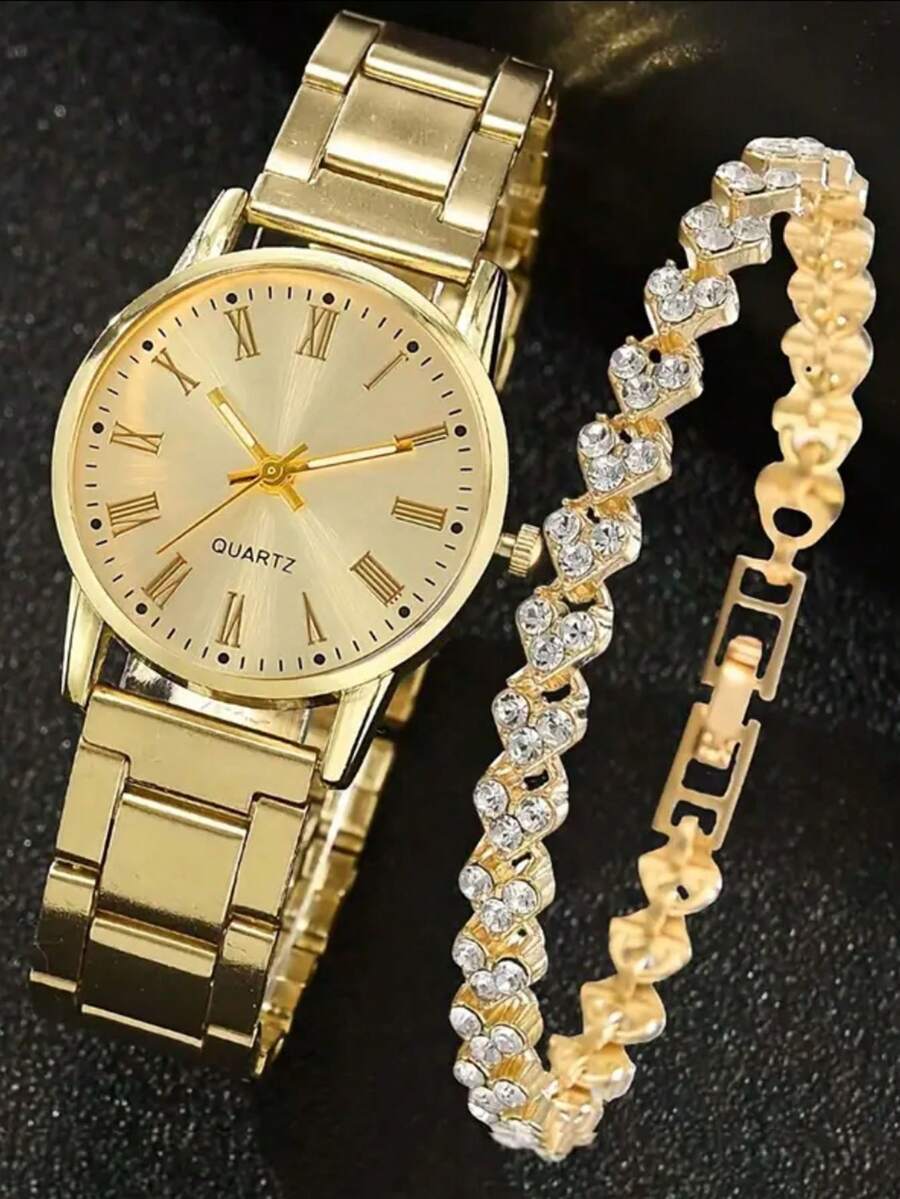 > 腕時計 レディース セット 女性用ゴールドメタルバンド 2個セット、ファッショナブルでカジュアルなローマ数字ダイヤル クォーツ腕時