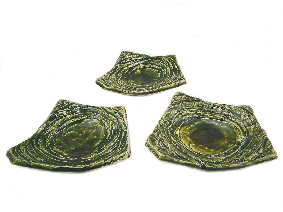 > ★2【未使用品】 金本卓也 大和織部 足付皿 変形 3枚 和食器 焼き物 陶磁器★/H