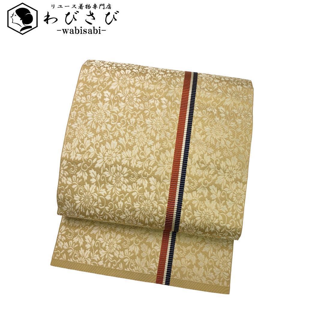 > 名古屋帯 本場筑前博多織 縦縞模様に花唐草模様 藁色 O-5445 着物 きもの kimono 和服 和装 中古 リサイクル着物 【送料無料】