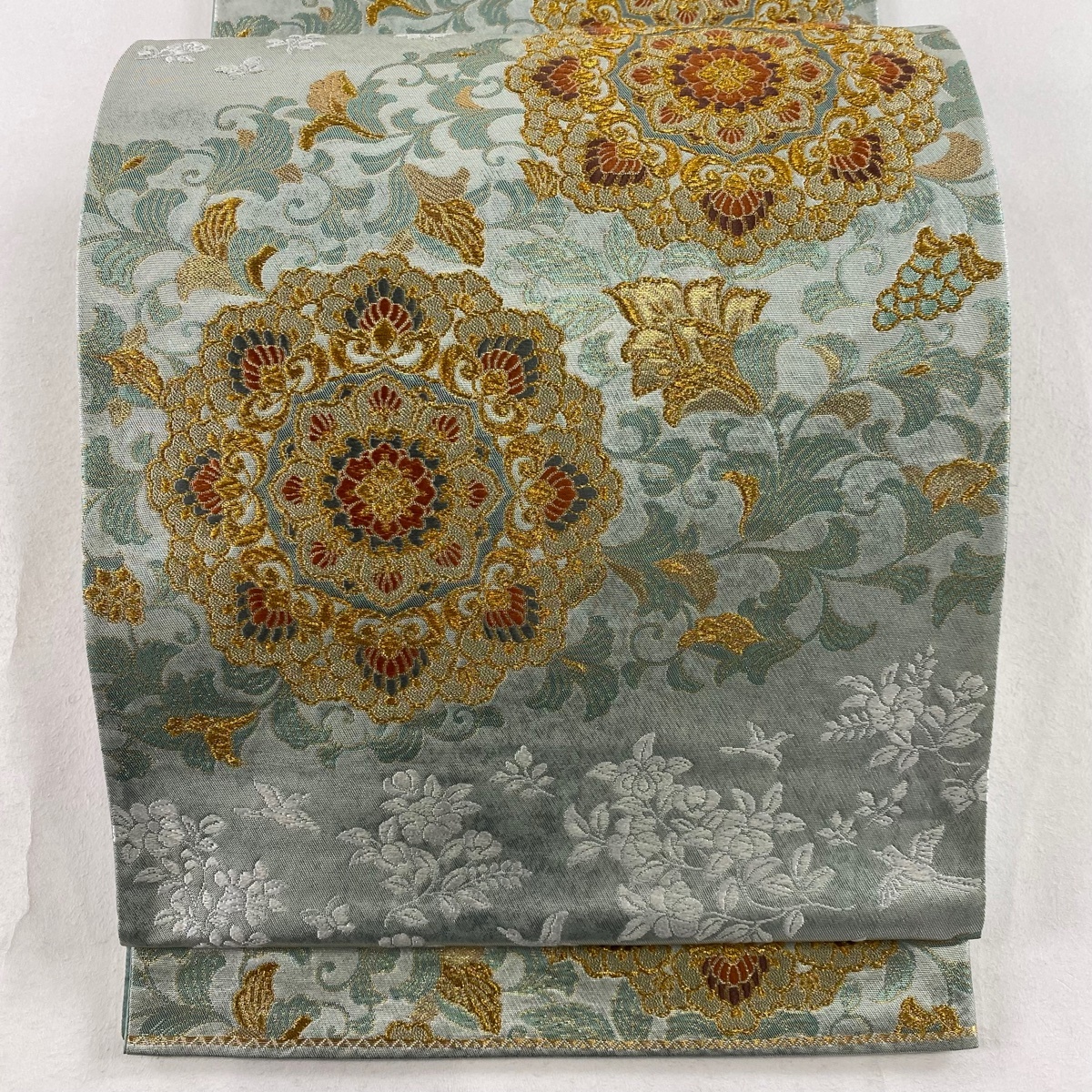 > 袋帯 美品 秀品 関西仕立て 天平瑞宝唐草文 華文 草花 金糸 箔 薄緑 六通 正絹 【中古】