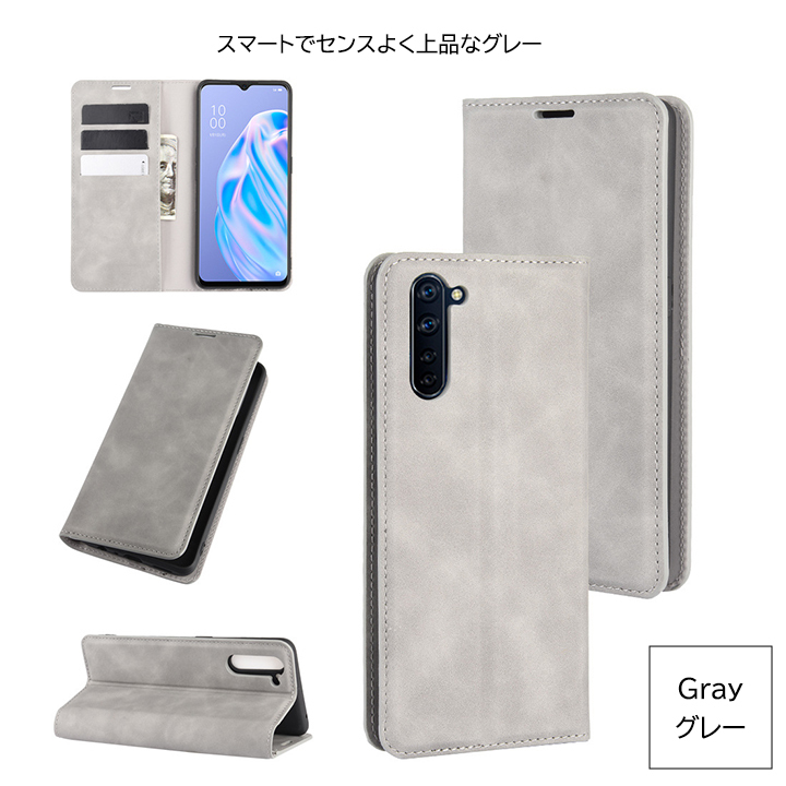 - OPPO Reno3A レザーケース「グレー」 オッポ リノ3A 手帳型 opporeno3a スマホケース レザーケース マグネット式 お洒落 高級