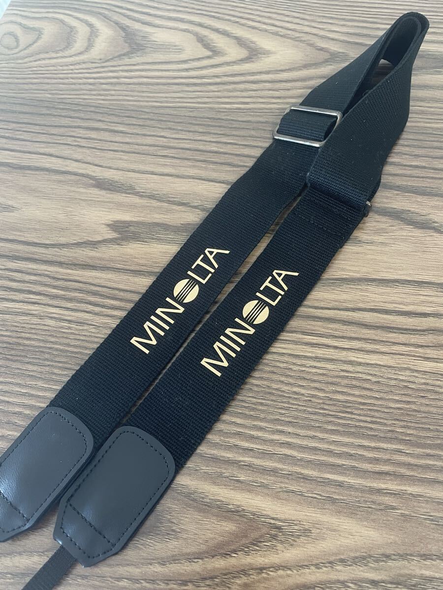 - MINOLTA ミノルタ カメラストラップ 未使用品 ブラック黒 幅39mm 純正 ゴールド文字 プリント文字 長さ調節可能