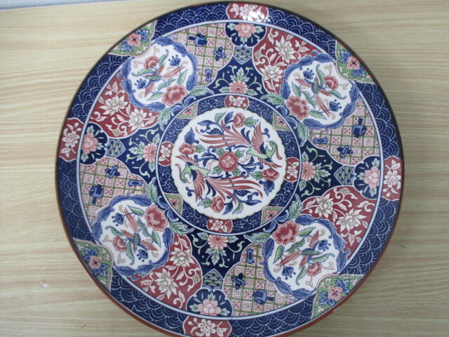 > ○【中古】貞峰作 鳳凰 牡丹 文様 色絵金彩飾皿 伝統美術工芸 大盤 大皿 浅盤 陶瓷器 激安 1円スタート