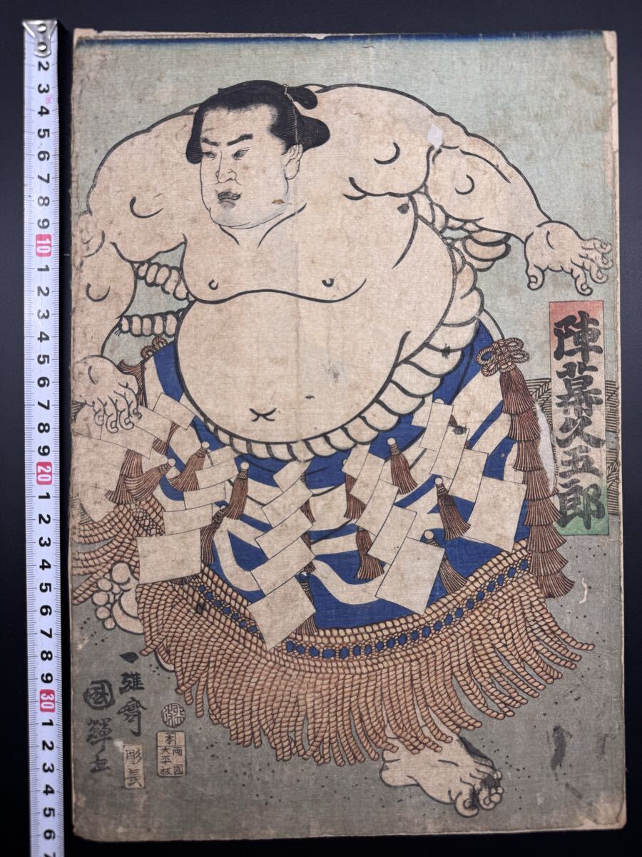 - 【真作】相撲!本物浮世絵木版画 歌川国輝「陣幕久五郎」江戸期 錦絵 大判 保存良い 裏打ち