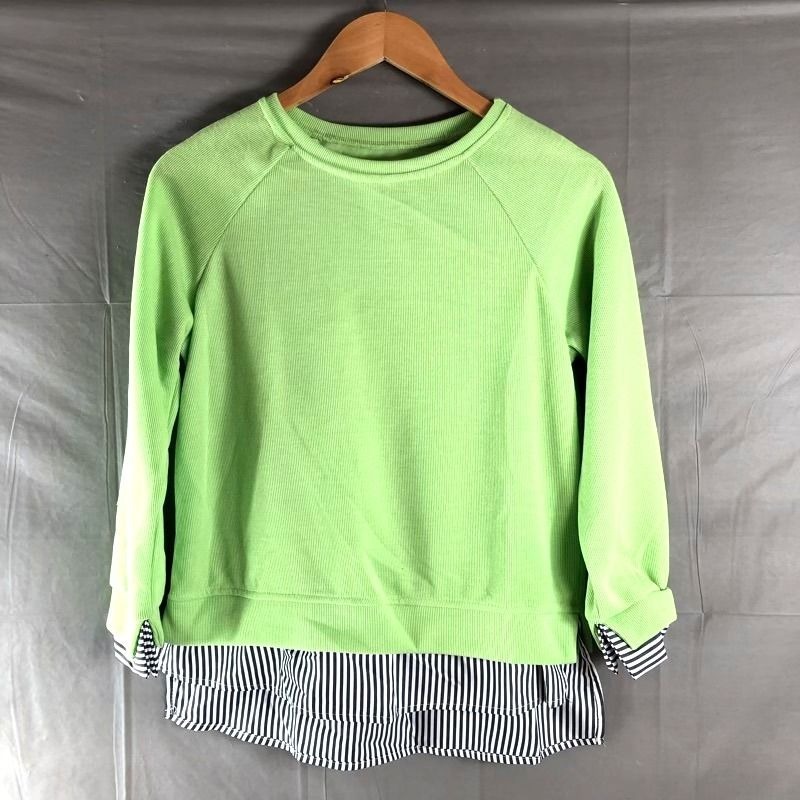 - カットソー 異素材ドッキング 裾ストライプ 長袖 ラグラン グリーン系 黄緑 Sサイズ 2025082500284