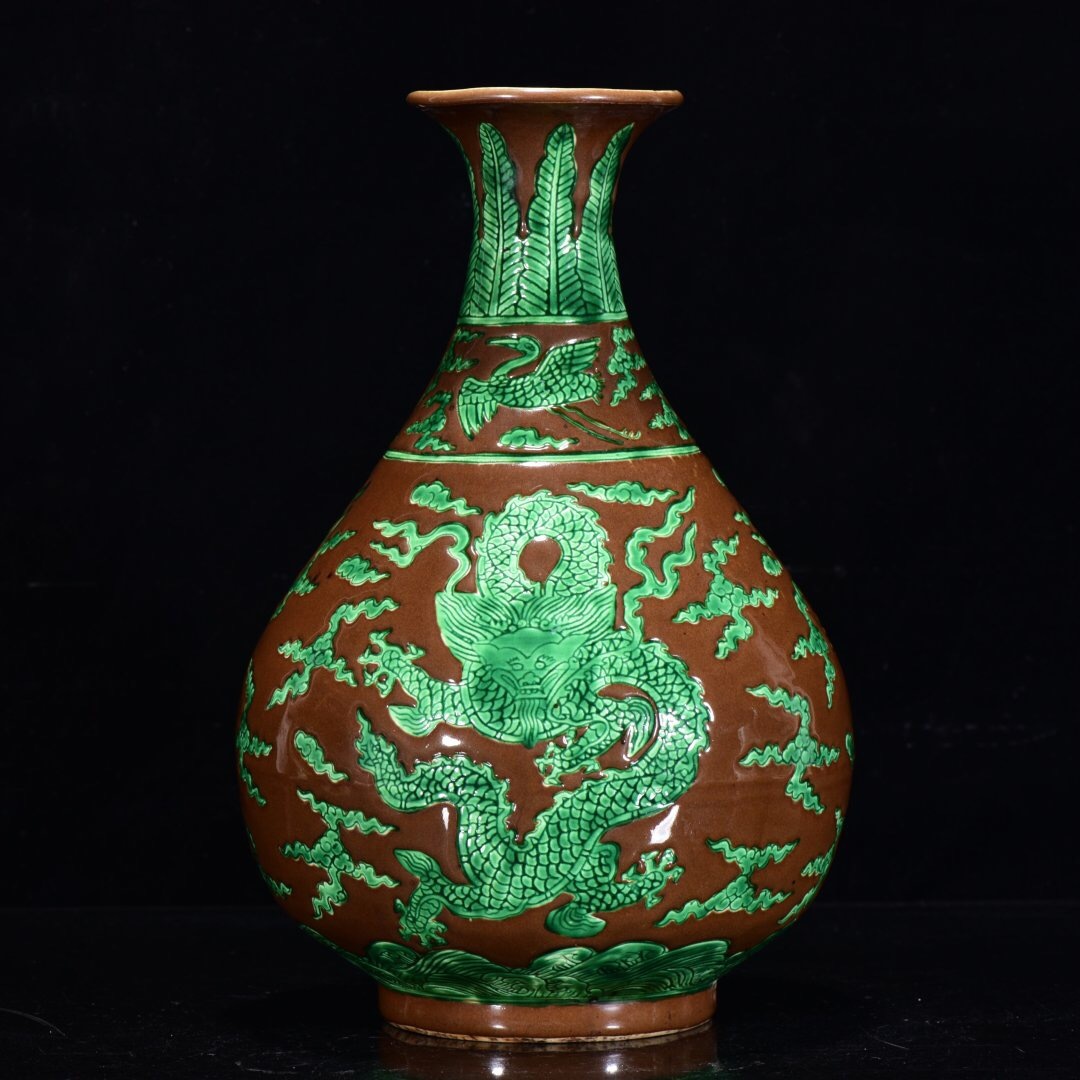 - 【超珍館蔵】明 宣德年製款 古陶瓷品 綠彩 龍紋 玉壺春瓶 陶藝 古賞物 古董品 古美術品 時代物 旧家蔵出 稀少珍蔵品