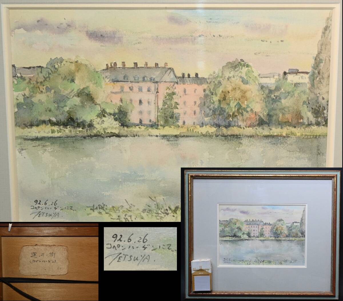 > 真贋保証■岩脇哲也■ 水彩『運河の街』コペンハーゲンにて 1992年6月26日 サイン有 額装 水彩連盟委員 日本美術家連盟会員風景画 絵画