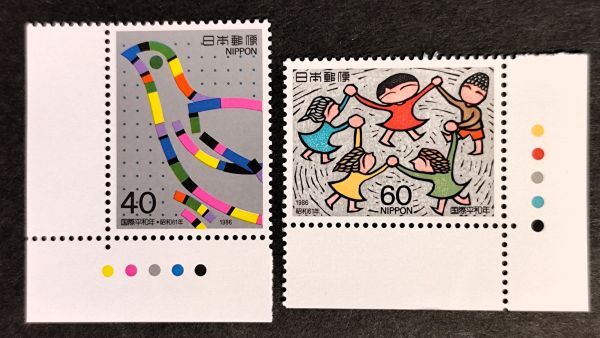 - [25091141]【国際平和年】単片全2種 CMカラーマーク付「鳩・手をつなぐ子供たち」40円+60円 1986年発行 美品