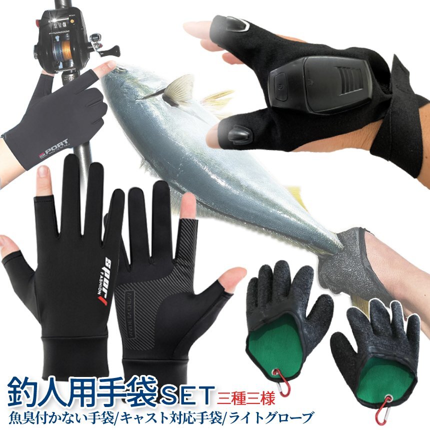- フィッシング 手袋 セット LED手袋 魚つかみ FITグローブ キャスト対応 魚臭防止 血抜き手袋 夜釣り グローブ 魚釣り 指出し GYOTEBUSET