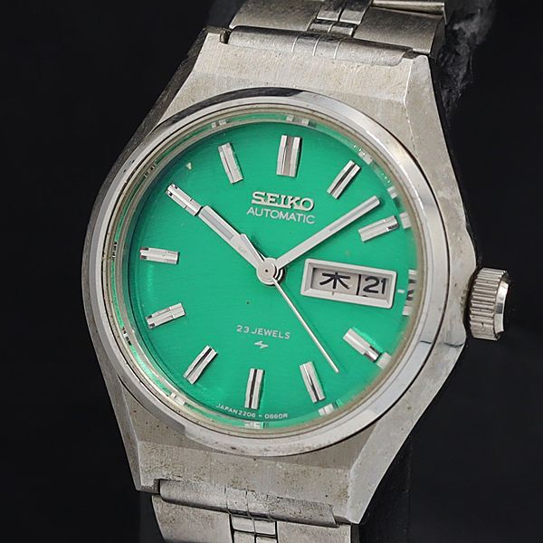 > 稼動 良品 セイコー AT/自動巻き 2206-0590 グリーン文字盤 ラウンド デイデイト 23石 レディース腕時計 2000000 NSK OMI