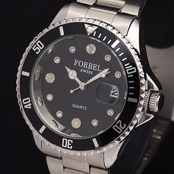 - 稼働 良品 フォーベル QZ FB-1088-DG 黒文字盤 石付 デイト ラウンド メンズ腕時計 KYM