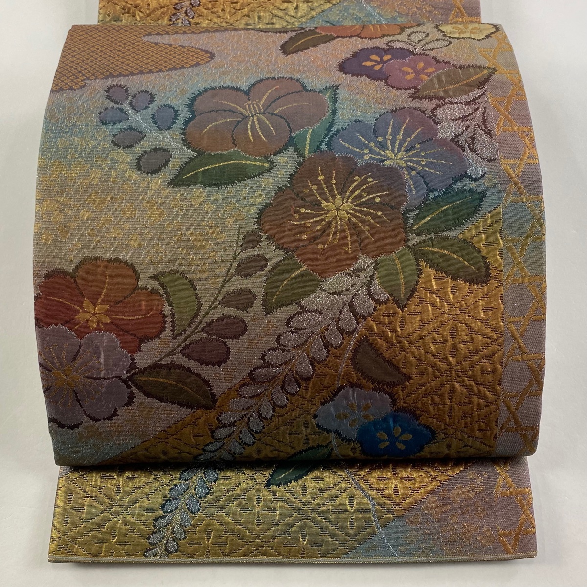 > 袋帯 美品 秀品 関西仕立て 草花 菱 箔 灰紫 六通 正絹 【中古】