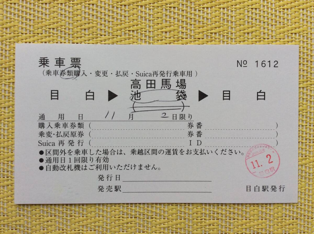 - JR東 乗車票 目白→高田馬場池袋→目白 軟券 白色無字紋 2016年