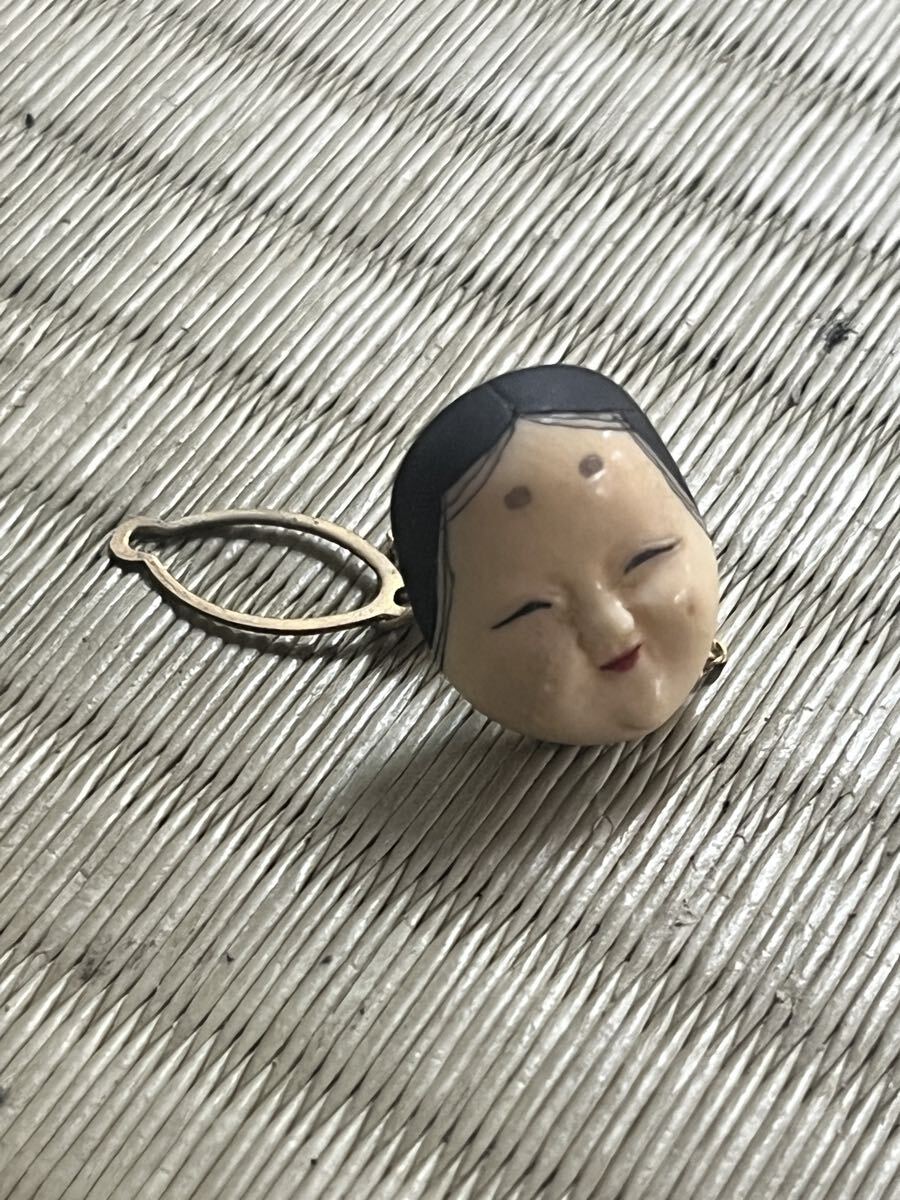 - 戸06d 根付 お面 彫刻 マンモス 精巧彫り 共箱 在銘 光行作 提げ物 ピンバッジ アクセサリー