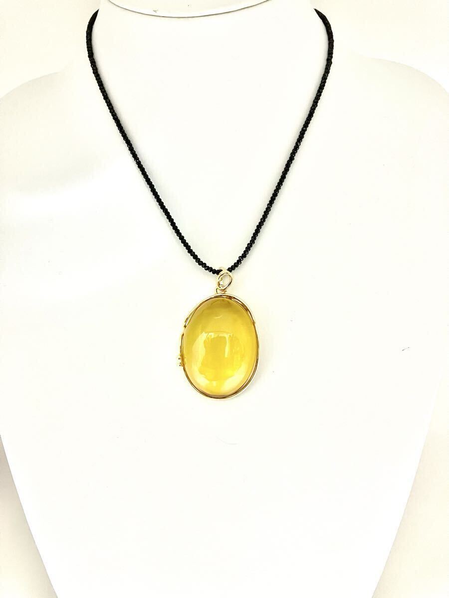 > 【新品】リトアニアイエロー産琥珀ネックレス/大ぶり/シンプル/ブラックスピネル/アンバー/こはくコハク/ 天然石/黄色/楕円型/オーバル