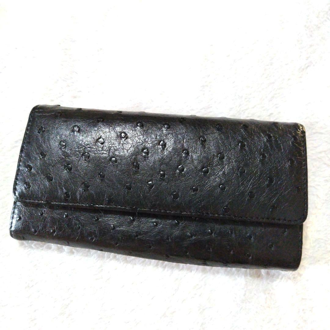 - オーストリッチ柄長財布 フラップ かぶせ 男女兼用 ロングウォレット 黒 メンズ レディース ブラック ホック 札入れ