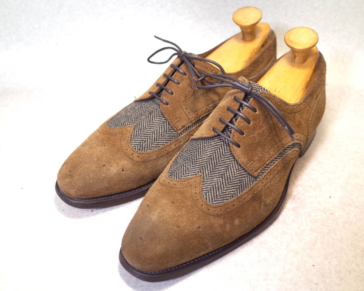 スエードレザーアッパーのバンプにツイードファブリックが配されたコンビ 外羽根5アイレットウイングチップ。