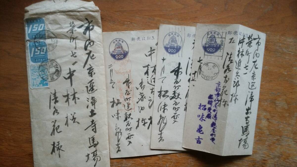 - 京都市竹屋町麩屋町「松味光松堂(筆屋さん)」の注文やりとりの 封書とはがき3点 昭和24年 並品です