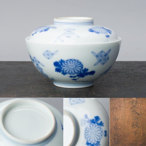 > 【千g823】菊・七宝繋文 染付 蓋碗 木箱「皇太子殿下 御召茶碗」 下賜 皇室 御下賜 茶碗