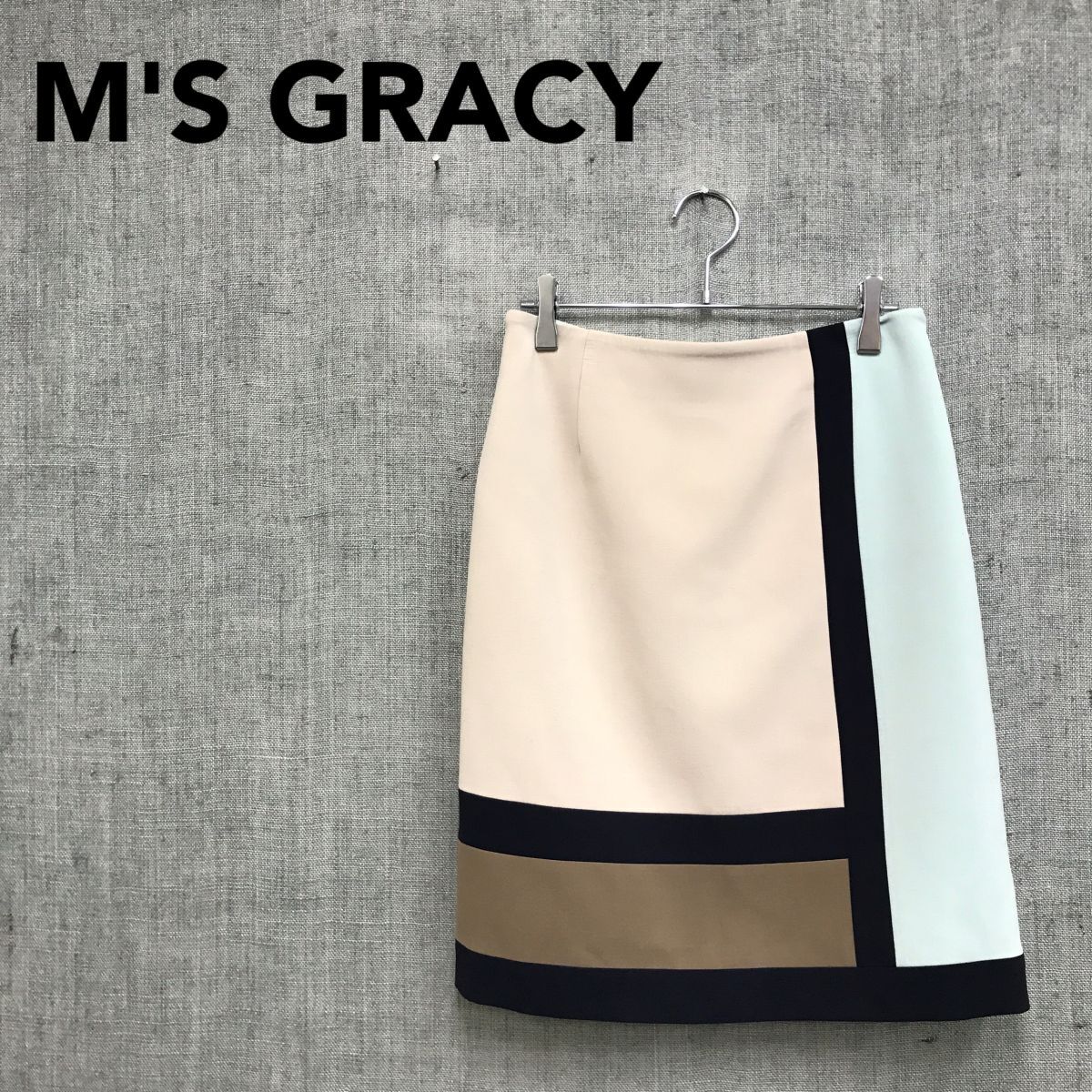 > 2K1796-R◆日本製 M'S GRACY エムズグレイシー 配色デザイン膝丈スカート◆サイズ38 レディース 婦人 ボトム パステルカラー グリーン