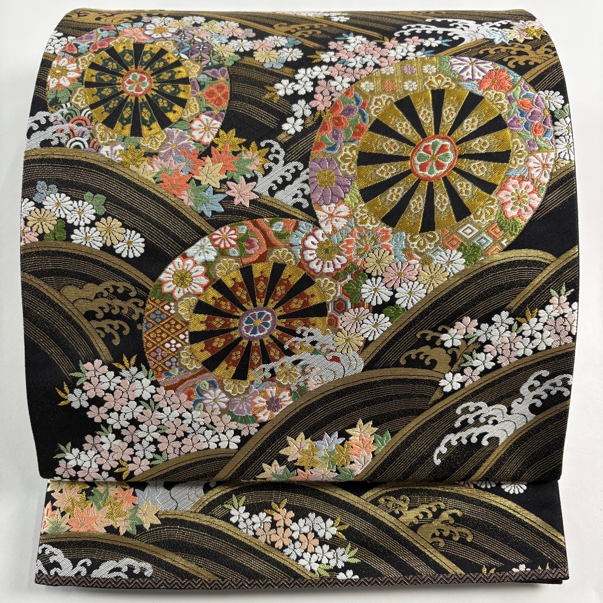 - 袋帯 美品 秀品 源氏車 波 金糸 箔 黒 六通 正絹 【中古】