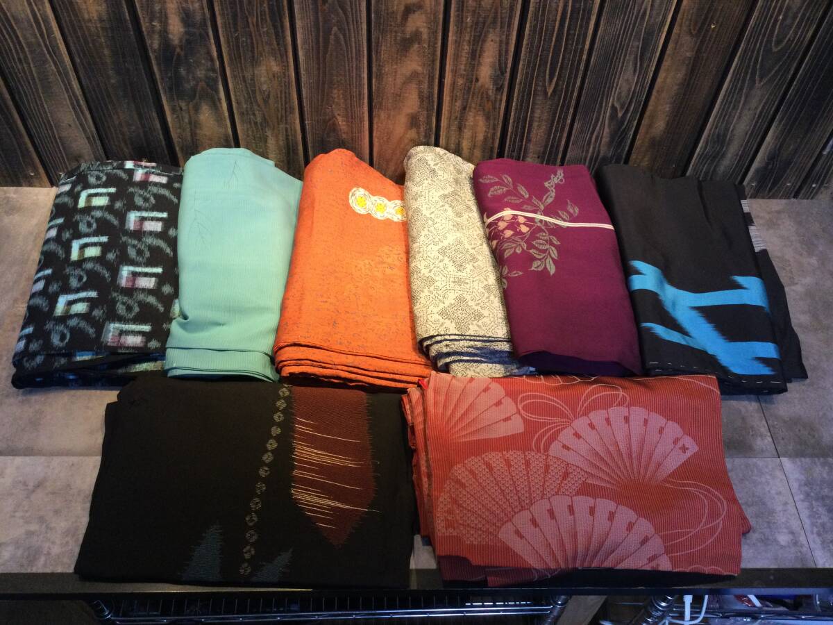 - 中古品・保管品 着物 紬 絣 色柄いろいろ まとめて8枚 昭和レトロ柄 リメイク素材 手芸 着物 和装 ジャンク